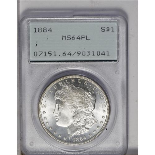 <B>1884<img border='0' src='http://www.heritagecoins.com/images/star.gif' width=10 height=10>$1> MS64 Prooflike PCGS.</B></I> Glittering and reflective fields contrast with the well struck, lightly frosted devices. This issue is elusive in a prooflike state. Housed in a first-generation PCGS holder. Population: 96 in 64, 28 finer (6/06).<BR><I>From The Chicago-Ark Collection.</B></I>