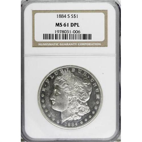<B>1884-S $1 MS61 Deep Mirror Prooflike NGC.</B></I> As late as 2005, in his <I>Guide Book of Morgan Silver Dollars</B></I>, Q. David Bowers described this issue as "unknown" in Deep Mirror Prooflike, going so far as to describe such a coin as "a Holy Grail in the Morgan series." Yet the facts of numismatics are susceptible to change, and new discoveries can render decades of common wisdom obsolete. Far from being "merely" Prooflike, this coin has powerful, flashy mirrors that unquestionably merit the Deep Mirror Prooflike designation, and the piece stands alone as the <B>only</B></I> Deep Mirror Prooflike representative ever graded by either NGC or PCGS (5/07).<BR> The 1884-S, while an available issue in circulated grades, becomes distinctly elusive in any Mint State grade. Unlike the famous S-mint issues from a few years before, the vast majority of 1884-S dollars saw considerable circulation, leaving only a handful of unworn survivors. With Mint or near-Mint condition as an inflexible prerequisite for Prooflike status, it is little wonder that few such pieces survive today, and that the survival of a Deep Mirror Prooflike coin would seem impossible.<BR> The surfaces of this distinctive coin exhibit powerful mirrors despite minor haze, and while the piece has little contrast (as Wayne Miller described Prooflike representatives of the issue in 1982), the fields offer reflectivity even at arm's length. The devices have crisp detail overall, with just a touch of the usual weakness present at the hair over Liberty's ear. While the dollar displays a number of scattered abrasions that justify the grade, including a number in the fields and on the lower right cheek, these flaws have surprisingly little impact on the overall eye appeal. A noteworthy example that should appeal to even the most discerning collector of the series.<BR><BR><b>Shipping:</b> Coins & Currency (<a target="_blank" href="http://www.heritageauctions.com/common/shipping.php">view shipping information</a>)