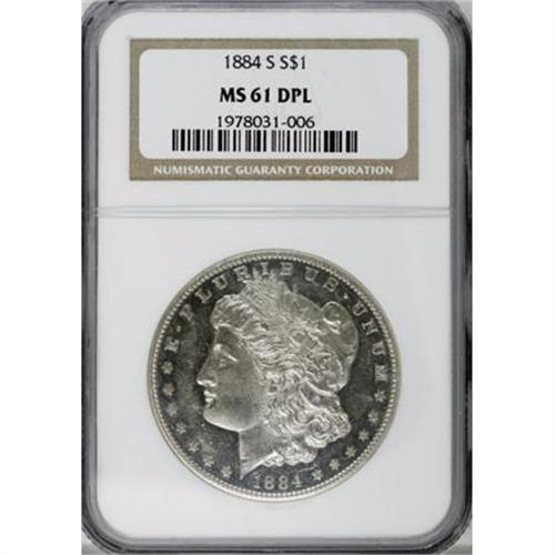 <B>1884-S $1 MS61 Deep Mirror Prooflike NGC.</B></I> As late as 2005, in his <I>Guide Book of Morgan Silver Dollars</B></I>, Q. David Bowers described this issue as "unknown" in Deep Mirror Prooflike, going so far as to describe such a coin as "a Holy Grail in the Morgan series." Yet the facts of numismatics are susceptible to change, and new discoveries can render decades of common wisdom obsolete. Far from being "merely" Prooflike, this coin has powerful, flashy mirrors that unquestionably merit the Deep Mirror Prooflike designation, and the piece stands alone as the <B>only</B></I> Deep Mirror Prooflike representative ever graded by either NGC or PCGS (5/07).<BR> The 1884-S, while an available issue in circulated grades, becomes distinctly elusive in any Mint State grade. Unlike the famous S-mint issues from a few years before, the vast majority of 1884-S dollars saw considerable circulation, leaving only a handful of unworn survivors. With Mint or near-Mint condition as an inflexible prerequisite for Prooflike status, it is little wonder that few such pieces survive today, and that the survival of a Deep Mirror Prooflike coin would seem impossible.<BR> The surfaces of this distinctive coin exhibit powerful mirrors despite minor haze, and while the piece has little contrast (as Wayne Miller described Prooflike representatives of the issue in 1982), the fields offer reflectivity even at arm's length. The devices have crisp detail overall, with just a touch of the usual weakness present at the hair over Liberty's ear. While the dollar displays a number of scattered abrasions that justify the grade, including a number in the fields and on the lower right cheek, these flaws have surprisingly little impact on the overall eye appeal. A noteworthy example that should appeal to even the most discerning collector of the series.<BR><BR><b>Shipping:</b> Coins & Currency (<a target="_blank" href="http://www.heritageauctions.com/common/shipping.php">view shipping information</a>)