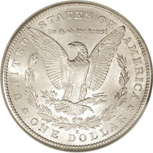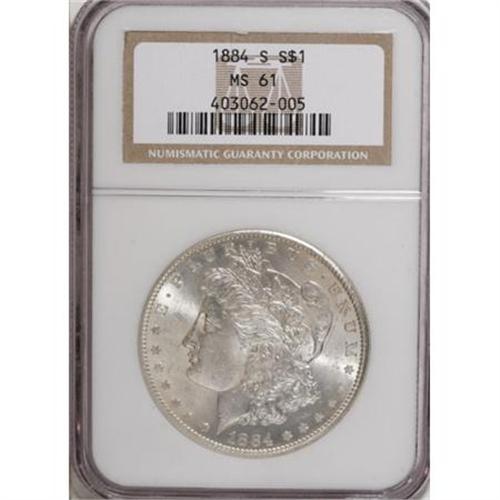 <B>1884-S $1 MS61 NGC.</B></I> While circulated examples of the 1884-S dollar are plentiful, Mint State pieces are elusive at all levels. Barely discernible wisps of light tan and ice-blue rest over the lustrous surfaces of this MS61 specimen, and a well directed strike brings up better-than-average definition on the design features. A few marks are scattered about, including a hair-thin one behind the cap. <BR><BR><B>Coin Engraver:</B> George T. Morgan<BR><BR><b>Shipping:</b> Coins & Currency (<a target="_blank" href="http://www.heritageauctions.com/common/shipping.php">view shipping information</a>)