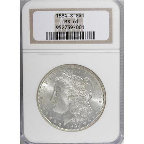 <B>1884-S $1 MS61 NGC.</B></I> Traces of caramel-gold toning visit this highly lustrous and lightly abraded silver dollar. Nicely struck and a pleasure to behold. Similar to the 1896-O and the 1901, the 1884-S is notoriously difficult to locate in true Mint State, although AU examples are regularly encountered.<BR><I>From The Silver Spur Collection of Morgan Dollars.</B></I><BR><BR><B>Coin Engraver:</B> George T. Morgan<BR><BR><b>Shipping:</b> Coins & Currency (<a target="_blank" href="http://www.heritageauctions.com/common/shipping.php">view shipping information</a>)