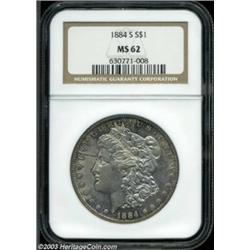 <table><tr><td><TABLE cellSpacing=0 cellPadding=0 width="100%" bgColor=#000000 border=0><TBODY> <TR><TD width="100%"><TABLE cellSpacing=1 cellPadding=3 width="100%" border=0><TBODY><TR><TD width="100%" bgColor=#79735c><FONT face=arial color=#ffffff size=3><B>Description</B> </FONT></TD></TR><TR><TD width="100%" bgColor=#ffffff><FONT face=arial size=2><B>1884-S $1 MS62 NGC.</B></I> Boldly struck, as is generally the case on true Uncirculated examples, with a liberal amount of purple and rose-golden patina on each side. Only a few facial marks and well concealed abrasions on the central devices substantially affect the numeric rating. </FONT></TD></TR></TBODY></TABLE></TD></TR></TBODY></TABLE><BR><A name=PricesRealized></A><TABLE cellSpacing=0 cellPadding=0 width="100%" bgColor=#000000 border=0><TBODY><TR><TD width="100%"><TABLE cellSpacing=1 cellPadding=3 width="100%" border=0><TBODY><TR><TD width="100%" bgColor=#79735c><A name=PR><FONT face=arial color=#ffffff size=3><B>Previous Prices from Heritage Auctions</B> </FONT></A></TD></TR><TR><TD bgColor=#f6f6ed><TABLE cellSpacing=0 cellPadding=0 width="100%" border=1><TBODY><TR><TD align=middle width="33%"><B>Date</B></TD><TD align=middle width="33%"><B>Service</B></TD><TD align=middle width="33%"><B>Price</B></TD></TR><TR bgColor=whitesmoke><TD width="33%"><B>05/31/2003</B></TD><TD width="33%">PCGS</TD><TD width="33%">$10,350.00</TD></TR><TR bgColor=whitesmoke><TD width="33%"><B>04/27/2002</B></TD><TD width="33%">NGC</TD><TD width="33%">$4,542.50</TD></TR><TR bgColor=whitesmoke><TD width="33%"><B>02/23/2002</B></TD><TD width="33%">PCGS</TD><TD width="33%">$8,050.00</TD></TR><TR bgColor=whitesmoke><TD width="33%"><B>01/05/2001</B></TD><TD width="33%">PCGS</TD><TD width="33%">$10,350.00</TD></TR><TR bgColor=whitesmoke><TD width="33%"><B>03/13/1999</B></TD><TD width="33%">NGC</TD><TD width="33%">$4,887.50</TD></TR><TR bgColor=whitesmoke><TD width="33%"><B>01/10/1998</B></TD><TD width="33%">NGC</TD><TD width="33%">$4,370.00</TD></TR><TR bgColor=whitesmoke><TD width="33%"><B>03/12/1993</B></TD><TD width="33%">PCGS</TD><TD width="33%">$6,600.00</TD></TR><TR bgColor=whitesmoke><TD width="33%"><B>05/01/1999</B></TD><TD width="33%">NGC</TD><TD width="33%">$4,600.00</TD></TR><TR bgColor=whitesmoke><TD width="33%"><B>08/01/1996</B></TD><TD width="33%">PCGS</TD><TD width="33%">$20,900.00</TD></TR><TR bgColor=whitesmoke><TD width="33%"><B>01/08/2002</B></TD><TD width="33%">PCGS</TD><TD width="33%">$9,775.00</TD></TR></TBODY></TABLE></TD></TR><TR><TD bgColor=#ffffff><FONT face=arial size=1 ?>PLEASE NOTE: All prices realized reflect the final hammer price PLUS the buyer's premium in auctions that charge a buyer's premium. Each item has a notation at the top of the listing indicating whether that lot included a buyer's premium. Example: A item that sells with a final hammer price of $100 and a 20% buyer's premium will display with a price realized of $120. All information listed is intended to be as accurate as possible, but errors are possible. Please use this guide carefully and inform us of any inaccuracies. </FONT></TD></TR></TBODY></TABLE></TD></TR></TBODY></TABLE><BR><TABLE cellSpacing=0 cellPadding=0 width="100%" bgColor=#000000 border=0><TBODY><TR><TD width="100%"><TABLE cellSpacing=1 cellPadding=3 width="100%" border=0><TBODY><TR><TD width="100%" bgColor=#79735c colSpan=6><FONT face=arial color=#ffffff size=3><B>Price Guide*</B> </FONT></TD></TR><TR bgColor=#f6f6ed><TD align=middle><B>Grade</B> </TD><TD align=middle><B>Coin World<BR>(Trends)</B> </TD><TD align=middle><B>Numismedia<BR>Retail</B> </TD><TD align=middle><B>Numismedia<BR>Wholesale</B> </TD><TD align=middle><B>Coin<BR>Universe</B> </TD><TD align=middle><B>Heritage<BR>Value Index</B> </TD></TR><TR bgColor=#ffffff><TD align=middle>61</TD><TD align=right>---</TD><TD align=right>---</TD><TD align=right>$4,975.00</TD><TD align=right>---</TD><TD align=right>$5,274.17</TD></TR><TR style="FONT-WEIGHT: bold" bgColor=#cccfdd><TD align=middle>62</TD><TD align=right>$9,000.00</TD><TD align=right>---</TD><TD align=right>$7,775.00</TD><TD align=right>$8,500.00</TD><TD align=right>$7,277.50</TD></TR><TR bgColor=#ffffff><TD align=middle>63</TD><TD align=right>$25,000.00</TD><TD align=right>---</TD><TD align=right>$21,750.00</TD><TD align=right>$28,500.00</TD><TD align=right>$17,883.33</TD></TR><TR bgColor=#ffffff><TD colSpan=6><FONT size=1>*All information listed is intended to be as accurate as possible, but errors are possible. No item may be returned or refused based on this information which is provided as a service to our customers. You should contact each pricing source directly to determine the accuracy of this information. </FONT></TD></TR></TBODY></TABLE></TD></TR></TBODY></TABLE><BR><TABLE cellSpacing=0 cellPadding=0 width="100%" bgColor=#000000 border=0><TBODY><TR><TD width="100%"><TABLE cellSpacing=1 cellPadding=3 width="100%" border=0><TBODY><TR><TD width="100%" bgColor=#79735c><FONT face=arial color=#ffffff size=3><B>Population Guide</B> </FONT></TD></TR><TR bgColor=#ffffff><TD align=middle><!-- Begin Output of Population Grid--><TABLE cellSpacing=0 cellPadding=0 width="100%" border=0><TBODY><TR><TD vAlign=center><TABLE cellSpacing=0 width="100%" border=1 cellsadding="3"><TBODY><TR><TD vAlign=center><TABLE cellSpacing=0 cellPadding=3 width="100%" border=1><TBODY><TR><TD vAlign=center align=middle bgColor=#f0f1e8 colSpan=2 <CENTER><FONT face=Arial size=2><B>PCGS Pop </B></FONT><CENTER></CENTER></TD><TD vAlign=center align=middle bgColor=#f0f1e8 colSpan=2><CENTER><FONT face=Arial size=2><B>NGC Pop</B></CENTER></FONT></TD></TR><TR><TD vAlign=center><FONT face=Arial size=2>(62)</FONT> </TD><TD vAlign=center align=right><FONT face=Arial size=2>68</FONT> </TD><TD vAlign=center><FONT face=Arial size=2>(62)</FONT> </TD><TD vAlign=center align=right><FONT face=Arial size=2>88</FONT> </TD></TR><TR><TD vAlign=center><FONT face=Arial size=2>(>62)</FONT> </TD><TD vAlign=center align=right><FONT face=Ar