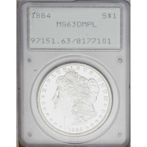 <B>1884<img border='0' src='http://www.heritagecoins.com/images/star.gif' width=10 height=10>$1> MS63 Deep Mirror Prooflike PCGS.</B></I> This brilliant and flashy piece is well struck and features exemplary eye appeal for the grade. Housed in a first generation capsule. <BR><BR><B>Important notice:</B> Heritage usually auctions material at the rate of 200-250 lots per hour. On some occasions eBay Live bid software or the Internet may not be able to keep up with the pace of the auction. We recommend placing a realistic absentee bid now as insurance to avoid disappointment. Occasionally the auctioneer may eliminate or reject an eBay Live bid, and the auctioneer may also reopen a lot after the close of the eBay live bidding (usually because we missed an audience bid), and may reject your bid even if it shows you as the winning bidder. By bidding via eBay Live, you agree that Heritage may award the lot to another bidder at its sole discretion under the circumstances described above or any other reasonable circumstances. Since eBay bids are not shown to us until we open the lot on the floor, we treat those bids just like floor bids. In most cases the floor responds before the eBay bid is presented to us, due to Internet lag time, so for consistency we have made it a policy that floor bids are always considered first over tie eBay live bids. Also please note that all Heritage lots purchased through eBay Live carry a 20% Buyer's Premium. Please make sure you read the Terms and Conditions before you bid. This lot is being auctioned in conjunction with a live floor auction by Heritage Galleries & Auctioneers. All final auction and invoice information will be supplied by Heritage Galleries & Auctioneers, and all other information should be considered preliminary. Lot:3387 <BR><BR><B>Winning Notification and Billing:</B> After the FINAL session in this auction is complete, Heritage will send e-mail and snail mail invoices. This process normally takes several days. All final auction and invoice information will be supplied by Heritage Galleries & Auctioneers, and all other information should be considered preliminary. <BR><BR>This auction will be conducted on a live auction floor and over the Internet through eBay Live. If you choose to place an absentee bid, please take a moment to <font color='#0000ff'><u><a href='http://pages.ebay.com/liveauctions/help/before/laabsentee.html'>learn how eBay Live absentee bidding works</a></u></font><font color='#000000'>