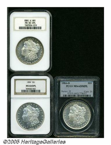 <B>1884<S$1> MS64 Deep Mirror Prooflike NGC; 1884-O MS64 Deep Mirror Prooflike NGC;</B></I> and an <B>1884-O Deep Mirror Prooflike PCGS,</B></I> all coins are virtually untoned, though the NGC-certified '84-O displays golden-brown peripheral patina.