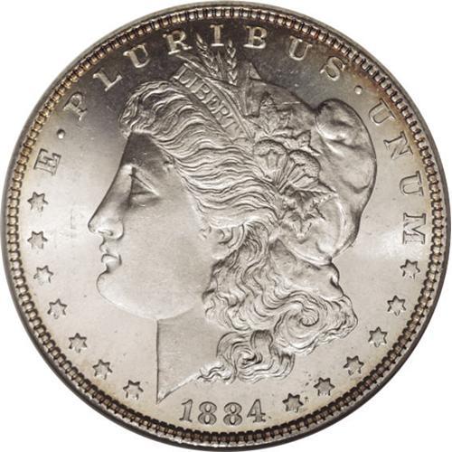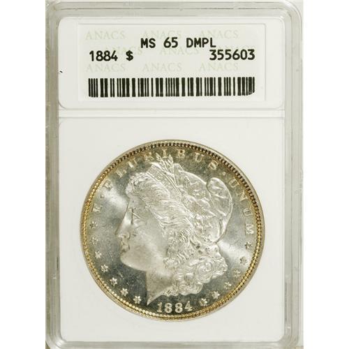<B>1884 S$1 MS65 Deep Mirror Prooflike ANACS.</B></I> This attractive Gem example offers nicely mirrored fields, with thick, even mint frost on the devices. Light gold-green color surrounds the peripheries, and just a few scattered luster marks are seen, especially in the left obverse field.<BR><BR><b>Shipping:</b> Coins & Currency (<a target="_blank" href="http://www.heritageauctions.com/common/shipping.php">view shipping information</a>)