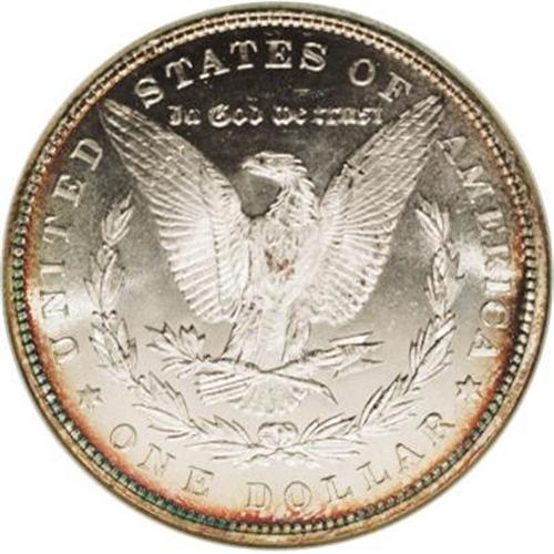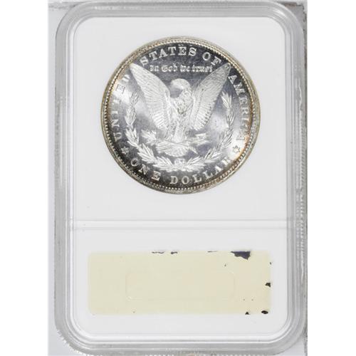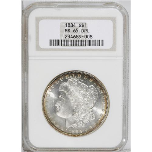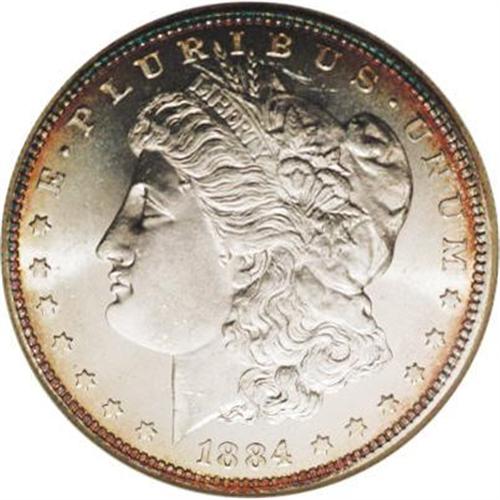 <B>1884<img border='0' src='http://www.heritagecoins.com/images/star.gif' width=10 height=10>$1> MS65 Deep Mirror Prooflike NGC.</B></I> A resplendent Gem with desirable cameo contrast created by a combination of deeply mirrored fields and lustrous devices. Both sides are sharply struck with brilliant silver surfaces framed by rich gold and iridescent toning. An additional small toning splash is visible on the eagle's breast.