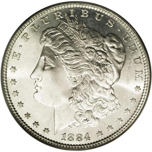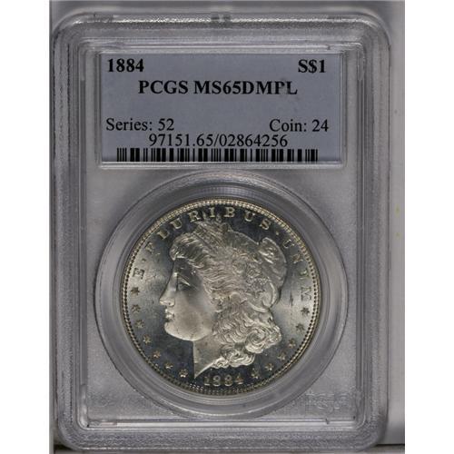 <B>1884<img border='0' src='http://www.heritagecoins.com/images/star.gif' width=10 height=10>$1> MS65 Deep Mirror Prooflike PCGS.</B></I> A splendid example of this seldom-seen Morgan dollar. The fields are deeply reflective and the devices heavily frosted. Sharply struck and problem-free throughout with a completely untoned appearance. Population: 27 in 65 DMPL, 5 finer (5/06).