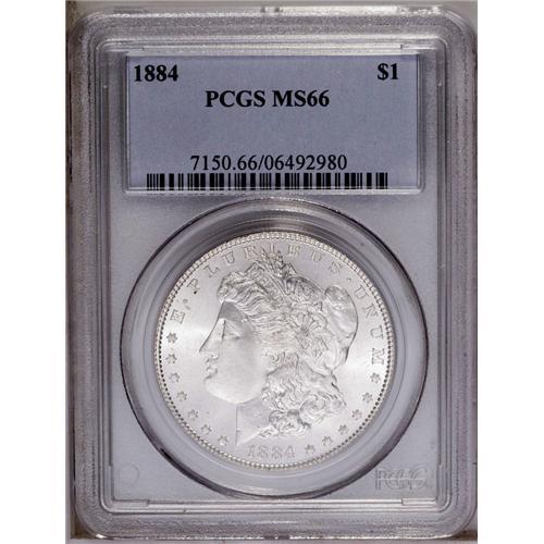 <B>1884<img border='0' src='http://www.heritagecoins.com/images/star.gif' width=10 height=10>$1> MS66 PCGS.</B></I> A high-end Premium Gem of this issue that varies widely in quality. This piece shows a bold strike, brilliant surfaces, and virtually no abrasions save for a pair of ticks on the chin. Appealing! PCGS has graded 30 coins finer (3/06). <BR><BR><B>Important notice:</B> Heritage usually auctions material at the rate of 200-250 lots per hour. On some occasions eBay Live bid software or the Internet may not be able to keep up with the pace of the auction. We recommend placing a realistic absentee bid now as insurance to avoid disappointment. Occasionally the auctioneer may eliminate or reject an eBay Live bid, and the auctioneer may also reopen a lot after the close of the eBay live bidding (usually because we missed an audience bid), and may reject your bid even if it shows you as the winning bidder. By bidding via eBay Live, you agree that Heritage may award the lot to another bidder at its sole discretion under the circumstances described above or any other reasonable circumstances. Since eBay bids are not shown to us until we open the lot on the floor, we treat those bids just like floor bids. In most cases the floor responds before the eBay bid is presented to us, due to Internet lag time, so for consistency we have made it a policy that floor bids are always considered first over tie eBay live bids. Also please note that all Heritage lots purchased through eBay Live carry a 20% Buyer's Premium. Please make sure you read the Terms and Conditions before you bid. This lot is being auctioned in conjunction with a live floor auction by Heritage Galleries & Auctioneers. All final auction and invoice information will be supplied by Heritage Galleries & Auctioneers, and all other information should be considered preliminary. Lot:3384 <BR><BR><B>Winning Notification and Billing:</B> After the FINAL session in this auction is complete, Heritage will send e-mail and snail mail invoices. This process normally takes several days. All final auction and invoice information will be supplied by Heritage Galleries & Auctioneers, and all other information should be considered preliminary. <BR><BR>This auction will be conducted on a live auction floor and over the Internet through eBay Live. If you choose to place an absentee bid, please take a moment to <font color='#0000ff'><u><a href='http://pages.ebay.com/liveauctions/help/before/laabsentee.html'>learn how eBay Live absentee bidding works</a></u></font><font color='#000000'>
