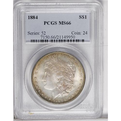 <B>1884<img border='0' src='http://www.heritagecoins.com/images/star.gif' width=10 height=10>$1> MS66 PCGS.</B></I> Dusky dove-gray and orange toning adorns both sides. The underlying surfaces display shimmering luster and are pleasantly free from marks.