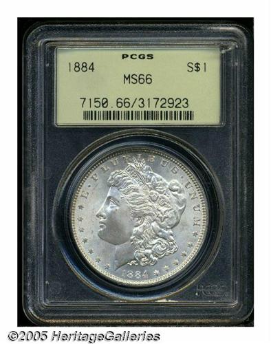 <B>1884<S$1> MS66 PCGS.</B></I> Light olive-gray color embraces this lustrous and suitably struck premium Gem. An impressive representative of this conditionally challenging issue; only 29 pieces have been certified finer by PCGS, as of (5/05). In a green label holder.