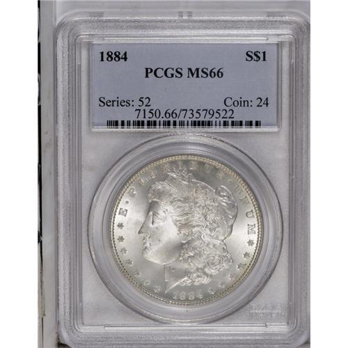 <B>1884<img border='0' src='http://www.heritagecoins.com/images/star.gif' width=10 height=10>$1> MS66 PCGS.</B></I> Slightly frosty with great luster. A touch of softness on Liberty's hair above the ear is typical for this issue and scarcely detracts from this coin's eye appeal.