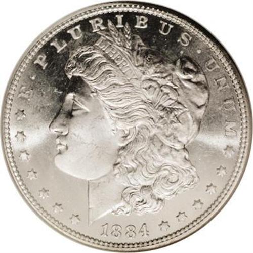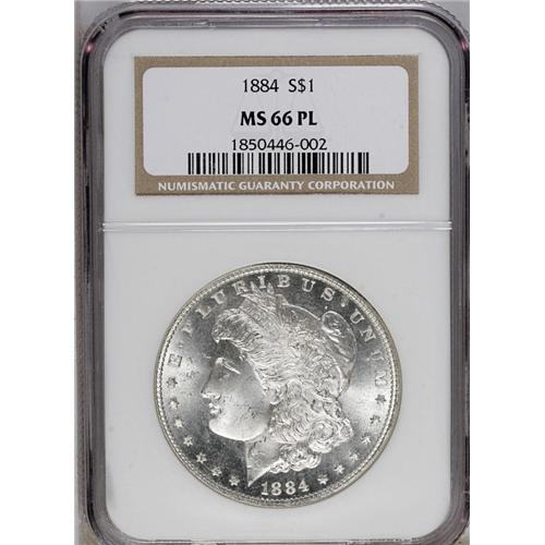 <B>1884<img border='0' src='http://www.heritagecoins.com/images/star.gif' width=10 height=10>$1> MS66 Prooflike NGC.</B></I> While a relatively common dollar without reflectivity in the fields, prooflike examples are very scarce. This is especially true of high grade prooflike coins. NGC has only certified five examples (as has PCGS) in MS66 PL, and only one piece is finer (a PCGS MS67). This is a fully struck example that is brilliant throughout. The fields are indeed shimmering and glassy with well-balanced reflectivity on each side. Exceptionally clean. An important coin for the Morgan specialist.