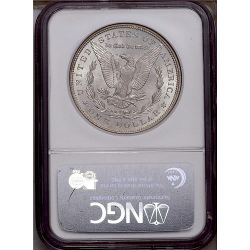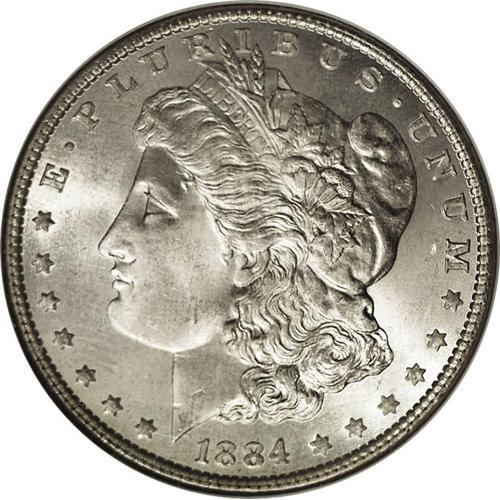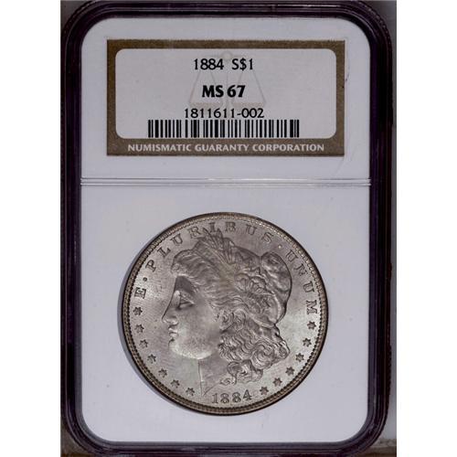 <B>1884<img border='0' src='http://www.heritagecoins.com/images/star.gif' width=10 height=10>$1> MS67 NGC.</B></I> With more than 14 million pieces struck, the 1884 is a common Morgan dollar in circulated grades. It becomes progressively more difficult to locate as one climbs the Mint State ladder. At the MS67 level it is rarely ever encountered. NGC has only certified 25 other pieces in MS67 with one finer, while PCGS has graded 29 pieces with a single coin in higher grade (4/06). This is an extraordinarily clean coin with pleasing frosted mint luster that is virtually untoned. Close examination shows the slightest hint of golden patina on each side. The design elements are sharply impressed, and just a few minor marks are noted on Liberty's cheek and neck.