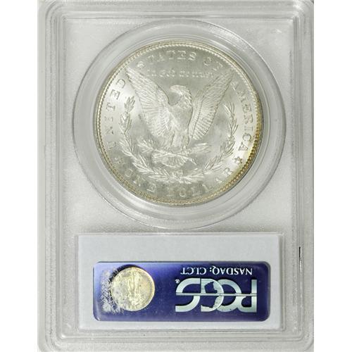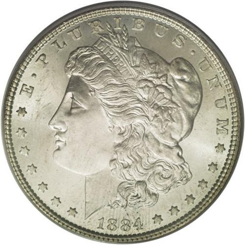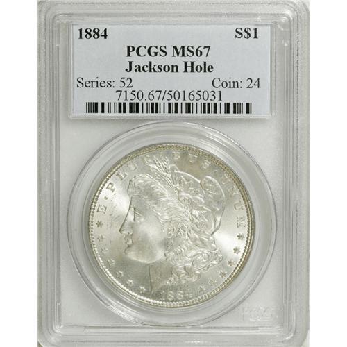 <B>1884 S$1 MS67 PCGS.</B></I> Ex: Jackson Hole. This coin's chief attribute is its satiny luster, complementing near-pristine surfaces. Only a single tick is noted, on Liberty's chin. The surfaces are untoned, save for some dark toning flecks in the date area and a tiny arc of steel-blue on the reverse above CA. If this were an 1884-S, it would be a half-million-dollar coin. As an 1884-P, it is one of 28 so graded at PCGS, with a single coin finer (2/07).<BR><I>From The Jackson Hole Collection.</B></I><BR><BR><b>Shipping:</b> Coins & Currency (<a target="_blank" href="http://www.heritageauctions.com/common/shipping.php">view shipping information</a>)
