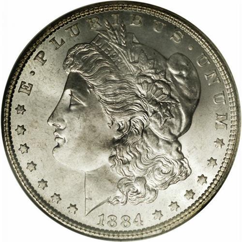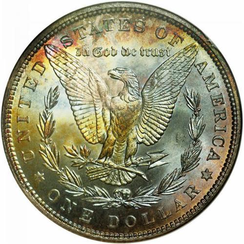 <B>1884<img border='0' src='http://www.heritagecoins.com/images/star.gif' width=10 height=10>$1> MS67 NGC.</B></I> The reverse is dominated with deep shades of sky-blue, red, antique-gold, and violet as if this was an end coin in a paper roll for a long time. The obverse is bright and untoned. Both sides show sharp definition and a remarkable absence of mentionable marks. A "must see" item for the toning enthusiast. Census: 27 in 67, 2 finer (4/06).