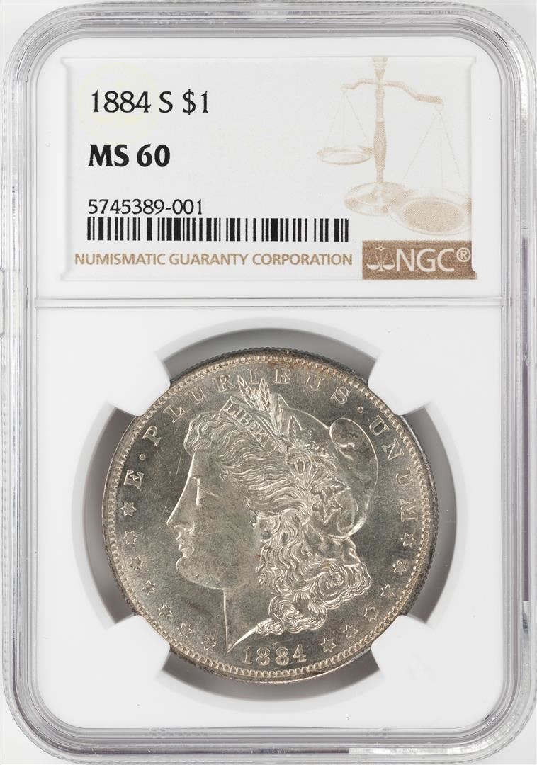 One 1884-S $1 Morgan Silver Dollar Coin NGC MS60. NGC Certified.