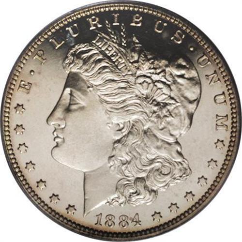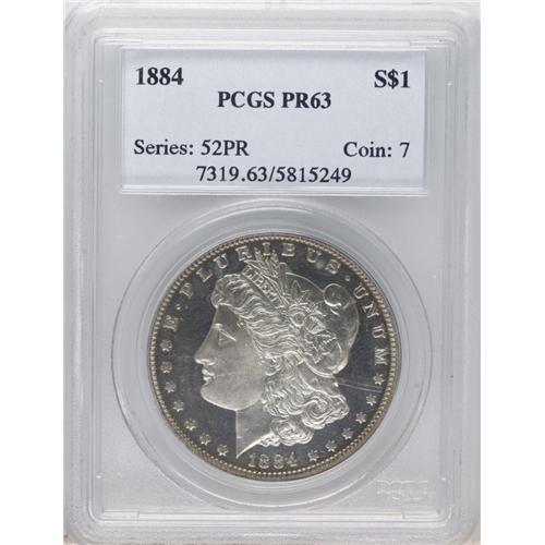 <B>1884 S$1 PR63 PCGS.</B></I> A glimmer of golden is noted on the surfaces, which remain essentially untoned. Considerable mint frost coats the devices, and there are no visible impairments in the fields. Some light slide marks visible on Liberty's cheek under a loupe prevent a higher grade. Population: 45 in 63, 82 finer (1/07).<BR><BR><b>Shipping:</b> Coins & Currency (<a target="_blank" href="http://www.heritageauctions.com/common/shipping.php">view shipping information</a>)