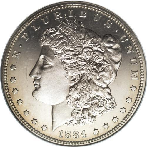 <B>1884 S$1 PR64 Cameo NGC.</B></I> The 1884 Morgan dollar mintage included 875 proofs, a relatively large number of which have survived to the present day. NGC and PCGS have seen fewer than 70 pieces with a Cameo designation, including the current near-Gem example. A wisp or two of barely discernible light gold color encircles the rim areas, and strong motif-field contrast stands out on both sides. A sharp strike rounds out the pleasing eye appeal. Some faint obverse field marks define the grade.<BR><I>From The Utah Collection.</B></I><BR><BR><b>Shipping:</b> Coins & Currency (<a target="_blank" href="http://www.heritageauctions.com/common/shipping.php">view shipping information</a>)
