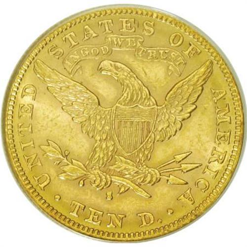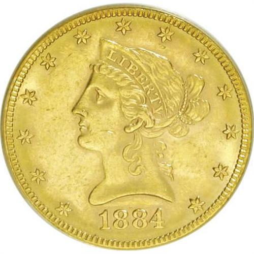 <B>1884-S $10 AU58 PCGS.</B></I> . PCGS Population (60/176). NGC Census: (112/267). Mintage: 124,250. Numismedia Wsl. Price for NGC/PCGS coin in AU58: $446. (#8705)<BR><BR><B>Coin Engraver:</B> Christian Gobrecht<BR><BR><b>Shipping:</b> Coins & Currency (<a target="_blank" href="http://www.heritageauctions.com/common/shipping.php">view shipping information</a>)