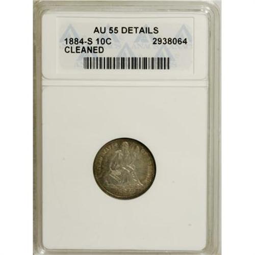 <B>1884-S 10C --Cleaned--ANACS. AU55 Details.</B></I> NGC Census: (1/44). PCGS Population (6/32). Mintage: 564,969. Numismedia Wsl. Price for NGC/PCGS coin in AU55: $290. (#4693)<BR><BR><B>Coin Engraver:</B> Christian Gobrecht<BR><BR><b>Shipping:</b> Coins & Currency (<a target="_blank" href="http://www.heritageauctions.com/common/shipping.php">view shipping information</a>\)