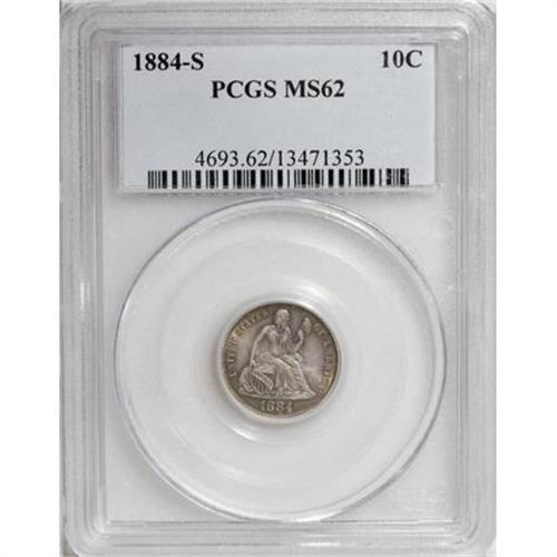 <B>1884-S 10C MS62 PCGS.</B></I> A mix of golden-gray, sky-blue, and lavender patina rests on both sides of this S-mint dime. Generally well struck, with a few minor obverse handling marks. <BR><BR><B>Coin Engraver:</B> Christian Gobrecht<BR><BR><b>Shipping:</b> Coins & Currency (<a target="_blank" href="http://www.heritageauctions.com/common/shipping.php">view shipping information</a>)
