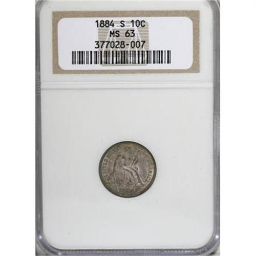 <B>1884-S 10C MS63 NGC.</B></I> Pleasingly detailed with no trace of wear, a challenging state of preservation for this heavily circulated issue. The luminous and lightly marked surfaces display delicate green-gold and silver-blue patina. Census: 16 in 63, 15 finer (10/07).<BR><BR><B>Coin Engraver:</B> Christian Gobrecht<BR><BR><b>Shipping:</b> Coins & Currency (<a target="_blank" href="http://www.heritageauctions.com/common/shipping.php">view shipping information</a>)