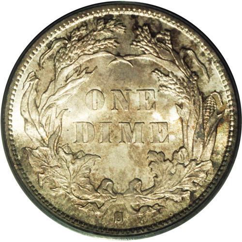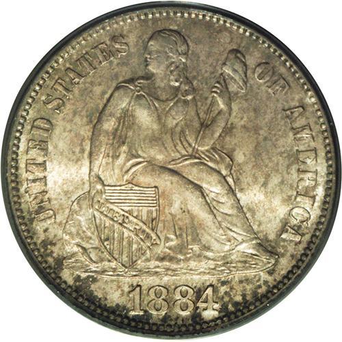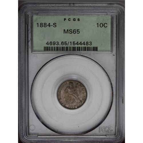 <B>1884-S<10C> MS65 PCGS.</B></I> A fully lustrous Gem in an older green-label PCGS holder with speckled gold and iridescent toning over frosty surfaces. This is a scarce date in higher grades, and particularly elusive in Gem quality. Nearly all of the 564,969 coins struck went into circulation along the west coast, and few were saved. Population: 1 in 65, 1 finer (3/06).