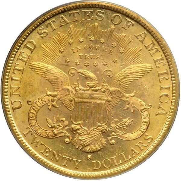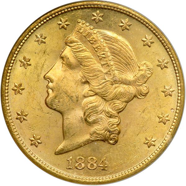 1884-S $20 Liberty. PCGS graded MS-63. Lovely golden toning on both sides, which gives this fully struck MS63 plenty of room to display its light overlay of natural color. Close examination reveals some small marks consistent with the grade. The luster is frosted; the strike well up there in terms of detail and desirablility. Destined for a fine Double Eagle collection. Pop 279; 7 in 63+; 18 in 64; 1 in 65 (PCGS # 9002) .