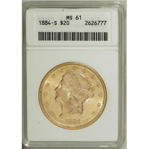 <B>1884-S $20 MS61 ANACS.</B></I> NGC Census: (790/637). PCGS Population (351/898). Mintage: 916,000. Numismedia Wsl. Price for NGC/PCGS coin in MS61: $740. (#9002)<BR><BR><B>Coin Engraver:</B> James B. Longacre<BR><BR><b>Shipping:</b> Coins & Currency (<a target="_blank" href="http://www.heritageauctions.com/common/shipping.php">view shipping information</a>\)