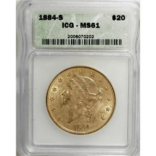 <B>1884-S $20 MS61 ICG.</B></I> NGC Census: (810/661). PCGS Population (382/971). Mintage: 916,000. Numismedia Wsl. Price for NGC/PCGS coin in MS61: $890. (#9002)<BR><BR><B>Coin Engraver:</B> James B. Longacre<BR><BR><b>Shipping:</b> Coins & Currency (<a target="_blank" href="http://www.heritageauctions.com/common/shipping.php">view shipping information</a>)