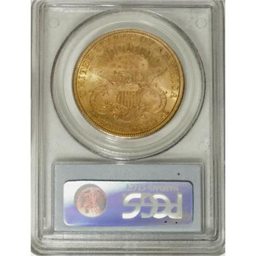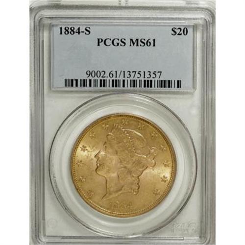 <B>1884-S $20 MS61 PCGS.</B></I> In 1884, the Mints' combined output of double eagles fell below a million pieces, though San Francisco produced the lion's share. This satiny and solidly struck apricot-gold piece displays a number of grade-defining abrasions on the portrait and in the fields.<BR><BR><B>Coin Engraver:</B> James B. Longacre<BR><BR><b>Shipping:</b> Coins & Currency (<a target="_blank" href="http://www.heritageauctions.com/common/shipping.php">view shipping information</a>)