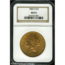<B>1884-S $20 MS62 NGC.</B></I> A premium quality piece for the grade with flashy luster, lightly marked surfaces, and an above average strike. An example that should get premium bid consideration as MS63's trade at a significant premium to MS62's.<BR><I>From The Richard J. Chouinard Collection of United States Coins, Part Two.</B></I> Lot:9186