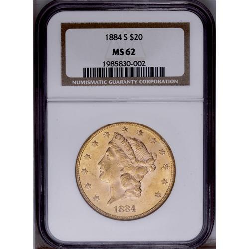 <B>1884-S $20 MS62 NGC.</B></I> Lightly abraded but fully lustrous surfaces with excellent eye appeal. Both sides have rich orange-gold coloration with pinkish highlights.