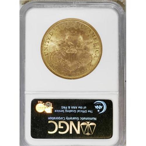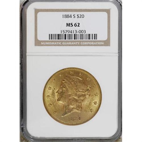 <B>1884-S $20 MS62 NGC.</B></I> Apricot-gold and mint-green patina enriches softly lustrous surfaces. Well struck throughout, with minute marks and scuffs accounting for the grade.<BR><BR><B>Coin Engraver:</B> James B. Longacre<BR><BR><b>Shipping:</b> Coins & Currency (<a target="_blank" href="http://www.heritageauctions.com/common/shipping.php">view shipping information</a>)