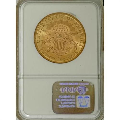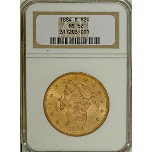 <B>1884-S $20 MS62 NGC.</B></I> A very lustrous example with the fields colored a rich olive-gold and the devices showing a bit darker patination at the highest points. The fields are remarkably clean for a coin in this grade. <BR><BR><B>Coin Engraver:</B> James B. Longacre<BR><BR><b>Shipping:</b> Coins & Currency (<a target="_blank" href="http://www.heritageauctions.com/common/shipping.php">view shipping information</a>)