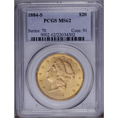 <B>1884-S<$20> MS62 PCGS.</B></I> A suitably struck green-gold and salmon-pink double eagle with good eye appeal for the grade, despite a few wispy abrasions on the lower right obverse field.