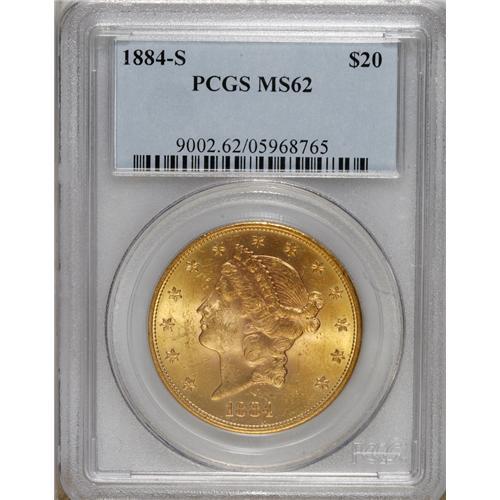 <B>1884-S $20 MS62 PCGS.</B></I> Intense luster is noted across both sides of this olive and apricot representative. The reverse is surprisingly clean for the grade, and the obverse is attractive despite a couple of clusters of moderate marks. The '84-S is a difficult issue to locate in finer Mint State grades, despite a respectable mintage of 916,000 pieces.<BR><BR><b>Shipping:</b> Coins & Currency (<a target="_blank" href="http://www.heritageauctions.com/common/shipping.php">view shipping information</a>)