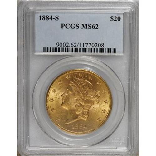 <B>1884-S $20 MS62 PCGS.</B></I> PCGS Population (695/236). NGC Census: (552/92). Mintage: 916,000. Numismedia Wsl. Price for NGC/PCGS coin in MS62: $1,075. (#9002)<BR><BR><B>Coin Engraver:</B> James B. Longacre<BR><BR><b>Shipping:</b> Coins & Currency (<a target="_blank" href="http://www.heritageauctions.com/common/shipping.php">view shipping information</a>)