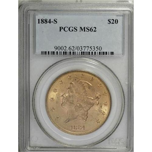 <B>1884-S $20 MS62 PCGS.</B></I> . PCGS Population (742/242). NGC Census: (569/93). Mintage: 916,000. Numismedia Wsl. Price for NGC/PCGS coin in MS62: $1,100. (#9002)<BR><BR><B>Coin Engraver:</B> James B. Longacre<BR><BR><b>Shipping:</b> Coins & Currency (<a target="_blank" href="http://www.heritageauctions.com/common/shipping.php">view shipping information</a>)