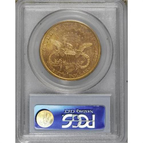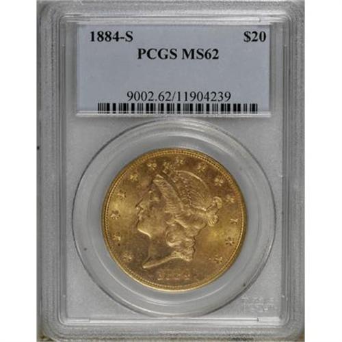 <B>1884-S $20 MS62 PCGS.</B></I> The peach-gold fields exhibit mild reflectivity, although cartwheel luster is also present. This boldly struck double eagle lacks oppressive marks, and has superior eye appeal for its designated grade.<BR><BR><B>Coin Engraver:</B> James B. Longacre<BR><BR><b>Shipping:</b> Coins & Currency (<a target="_blank" href="http://www.heritageauctions.com/common/shipping.php">view shipping information</a>)