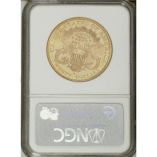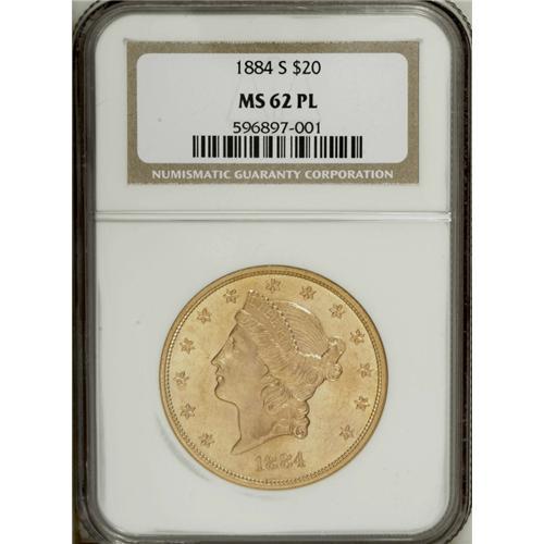 <B>1884-S $20 MS62 Prooflike NGC.</B></I> The devices on this gold-orange double eagle are sharply defined. Lightly abraded and moderately reflective with greater clarity on the reverse. Census: 2 in 62 Prooflike, 0 finer (10/06).<BR><BR><b>Shipping:</b> Coin/Currency (<a target="_blank" href="http://www.heritageauctions.com/common/shipping.php">view shipping information</a>)