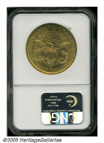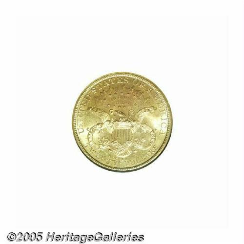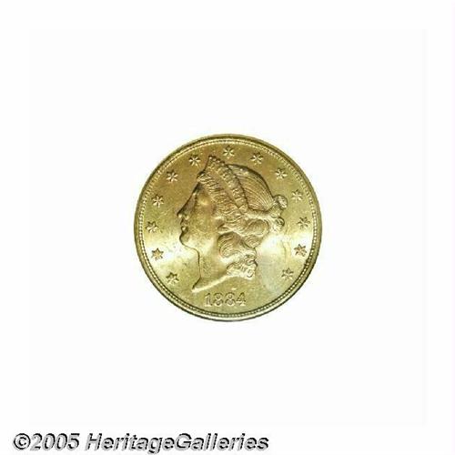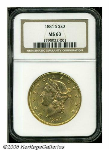 <B>1884-S<$20> MS63 NGC.</B></I> Like most Double Eagle issues from the San Francisco Mint, the 1884-S is available in bagmarked grades. However, Select examples with pleasing surfaces are certainly scarce. Only a couple of grade-limiting abrasions are noted, and the specialist is suggested to seize this opportunity. Population: 81 in 63, 7 finer (6/05).