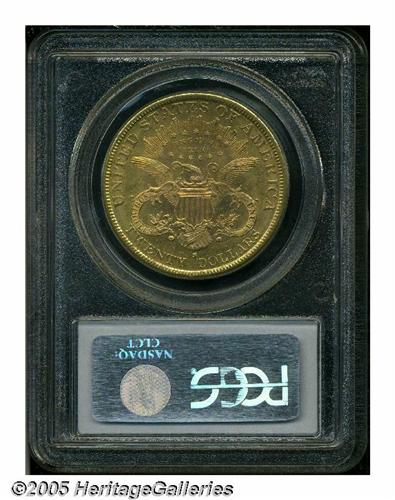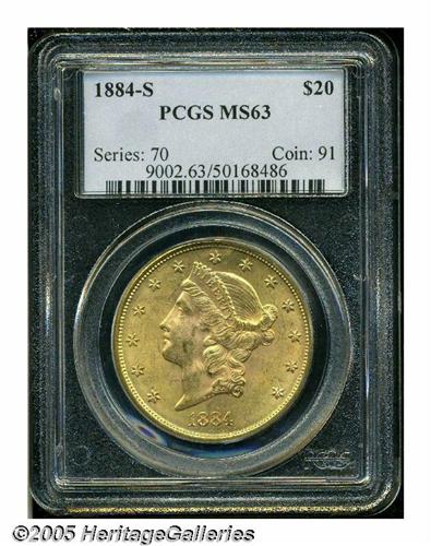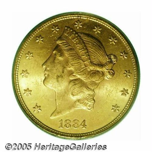 <B>1884-S<$20> MS63 PCGS.</B></I> A lustrous and boldly struck Double Eagle with pleasing dusky apricot-gold color. The fields are well preserved, and the cheek has only faint grazes. Traces of russet debris at the borders confirm the originality. The 1884-S is available in Mint State, as are most S-mint Liberty Twenties, but is infrequently located without prolific bagmarks. PCGS has certified a mere 13 pieces in finer grades, as of (5/05).