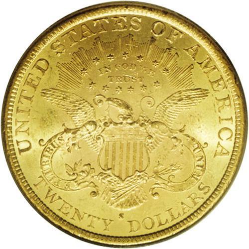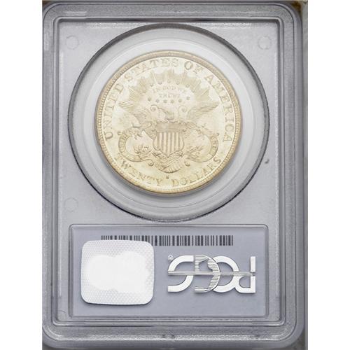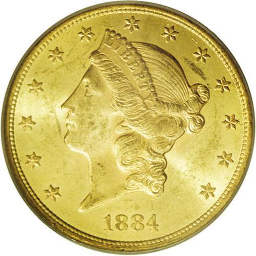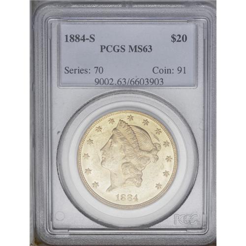 <B>1884-S<$20> MS63 PCGS.</B></I> Well frosted with pale orange accents primarily confined to the portrait and tinges of yellow-gold color elsewhere. Quite attractive and seldom offered in a finer condition. <BR><BR><B>Important notice:</B> Heritage usually auctions material at the rate of 200-250 lots per hour. On some occasions eBay Live bid software or the Internet may not be able to keep up with the pace of the auction. We recommend placing a realistic absentee bid now as insurance to avoid disappointment. Occasionally the auctioneer may eliminate or reject an eBay Live bid, and the auctioneer may also reopen a lot after the close of the eBay live bidding (usually because we missed an audience bid), and may reject your bid even if it shows you as the winning bidder. By bidding via eBay Live, you agree that Heritage may award the lot to another bidder at its sole discretion under the circumstances described above or any other reasonable circumstances. Since eBay bids are not shown to us until we open the lot on the floor, we treat those bids just like floor bids. In most cases the floor responds before the eBay bid is presented to us, due to Internet lag time, so for consistency we have made it a policy that floor bids are always considered first over tie eBay live bids. Also please note that all Heritage lots purchased through eBay Live carry a 20% Buyer's Premium. Please make sure you read the Terms and Conditions before you bid. This lot is being auctioned in conjunction with a live floor auction by Heritage Galleries & Auctioneers. All final auction and invoice information will be supplied by Heritage Galleries & Auctioneers, and all other information should be considered preliminary. Lot:4299 <BR><BR><B>Winning Notification and Billing:</B> After the FINAL session in this auction is complete, Heritage will send e-mail and snail mail invoices. This process normally takes several days. All final auction and invoice information will be supplied by Heritage Galleries & Auctioneers, and all other information should be considered preliminary. <BR><BR>This auction will be conducted on a live auction floor and over the Internet through eBay Live. If you choose to place an absentee bid, please take a moment to <font color='#0000ff'><u><a href='http://pages.ebay.com/liveauctions/help/before/laabsentee.html'>learn how eBay Live absentee bidding works</a></u></font><font color='#000000'>