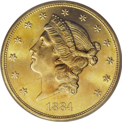 <B>1884-S $20 MS65 PCGS.</B></I> A flashy phenom, this is a coin that just should not exist, yet here it is: a strictly graded Gem S-mint Type Three Liberty double eagle, a coin that is conditionally rare not only as a date but as a S-mint of the <I>entire subtype.</B></I> Excluding the ubiquitous 1904-S issue, a total of only 40 S-mint Type Threes have achieved an MS65 grade at PCGS. In the June 11, 2004, monthly supplement of the <I>Coin Dealer Newsletter,</B></I> gold coin expert Mike Fuljenz wrote an extensive article titled "Top 10 Reasons To Own 'S' Mint $20 Liberties." Commenting specifically about the Type Three S-mint Liberty double eagles (the With Motto pieces having TWENTY DOLLARS spelled out on the reverse) minted from 1877-S to 1907-S, Fuljenz made cogent observations concerning the 1884-S as an issue: "Original mintage figure is more than ten times greater than 1884-CC, yet surprisingly, the 1884-S is actually almost as rare in total number of pieces still existing. Strike is very bold. Excellent luster with frosty texture. Scarce in MS-63, and still very rare in MS-64 or higher."<BR> The current combined NGC/PCGS population data show a total of 2311 <I>submission events,</B></I> (to hijack Bowers' term) of the 1884-CC, versus 3609 submissions of the 1884-S. Assuming that both issues are resubmitted in equal proportions, the 1884-CC is clearly rarer. On the other hand, the retail price differential from MS62 to MS63 for the 1884-CC is about 3x, while the differential for the 1884-S from MS62 to MS63 is about 5x--considerably more incentive for a "crackout artist" to resubmit high-end 1884-S coins in hope of achieving an upgrade--and perhaps confirmation of Fuljenz's argument. (However, we stress that this discussion of "crackout" potential is to explain why two issues for which similar rarity is claimed might lead to greater resubmissions in some of the lower Mint State grades for one over the other, thereby increasing the population quantities, and it applies only to the most frequently encountered Mint State levels--not to a rock-solid Gem such as the present piece.) Regardless of the actual number of coins existing, the two issues skew differently in terms of grade. The average 1884-CC piece grades AU50 or so, while the average 1884-S grades in the neighborhood of MS61+. PCGS' online price guide lists a value for the 1884-CC only up to MS63, and for the 1884-S only up to MS64. The inescapable fact remains that <I>the present coin is the single finest graded example at PCGS, and tied with four coins so graded at NGC (one of them rating the Star designation) (2/07).</B></I> As we earlier pointed out, it is one of only 40 Gem S-mint pieces of the entire subtype.<BR> The present piece boasts spectacular two-toned patina with shades of orange-gold around the margins and brighter yellow-gold in the centers. The reverse fields also show a semi-reflectivity that adds even more to the overall appeal of this piece. The devices are fully struck in all areas with bright, intense, frosted mint luster that swirls around each side. There are also no mentionable surface impairments on this magnificent double eagle. For the connoisseur of fine gold who really <I>buys the coin and not the slab,</B></I> or for the Registry Set collector of gold by type or date, this Gem 1884-S is an inescapable choice.<BR><BR><b>Shipping:</b> Coins & Currency (<a target="_blank" href="http://www.heritageauctions.com/common/shipping.php">view shipping information</a>)