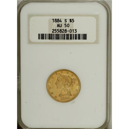 1884-S $5 AU50 NGC. NGC Census: (6/339). PCGS Popu