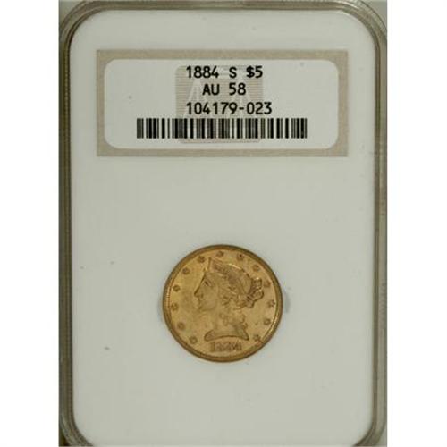 1884-S $5 AU58 NGC. NGC Census: (77/239). PCGS Pop