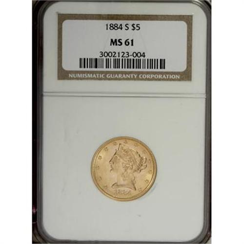 <B>1884-S $5 MS61 NGC.</B></I> . NGC Census: (82/155). PCGS Population (33/110). Mintage: 177,000. Numismedia Wsl. Price for NGC/PCGS coin in MS61: $358. (#8366)<BR><BR><B>Coin Engraver:</B> Christian Gobrecht<BR><BR><b>Shipping:</b> Coins & Currency (<a target="_blank" href="http://www.heritageauctions.com/common/shipping.php">view shipping information</a>)