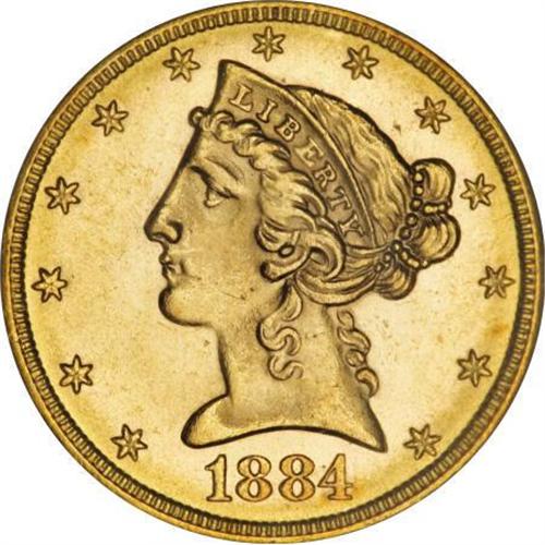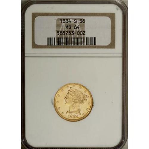 <B>1884-S $5 MS64 NGC.</B></I> This near-Gem is among the finest certified survivors available to today's gold collectors of this issue, a true condition rarity among later date Liberty half eagles. Lustrous surfaces exhibit appealing yellow-gold coloration and showcase a smooth, satiny texture. The few bagmarks that are present are small and well concealed. Gems are very nearly unavailable, as PCGS and NGC combined have graded only two examples finer than the presently offered example (11/07). <BR><BR><B>Coin Engraver:</B> Christian Gobrecht<BR><BR><b>Shipping:</b> Coins & Currency (<a target="_blank" href="http://www.heritageauctions.com/common/shipping.php">view shipping information</a>)