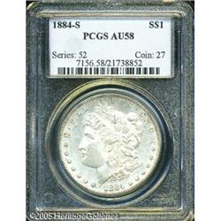 <B>1884-S<img border='0' src='http://www.heritagecoins.com/images/star.gif' width=10 height=10>$1 AU58 PCGS.</B></I> Just the slightest trace of friction is apparent on this scarce, key issue. Light gray-golden toning. Well struck with very few minor contact marks. Lot:10173
